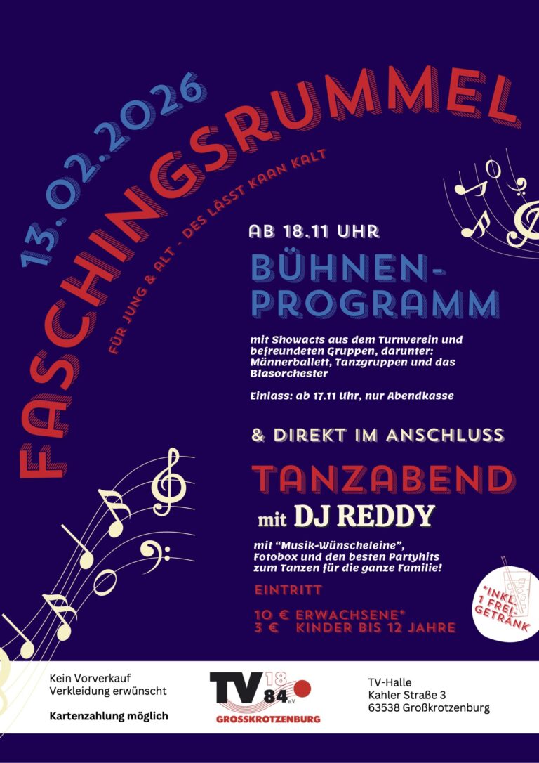 Der Turnverein 1884 e. V. Großkrotzenburg Blasorchester Fitness Frauengymnastik Freizeitsport Handball Jedermannsturnen Leichtathletik Rehasport Tanzen Tischtennis Turnen © DOSB/Sportdeutschland Jahre TVG 1 Mitglieder 1 Übungsgruppen 1 Wochenstunden 1 Hier gehts zur Online-Diensteinteilung