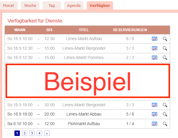 Im Online-Buchungssystem „SuperSaas“ seht ihr alle momentan verfügbaren Dienste (z.B. für den Limesmarkt, den Sportflohmarkt oder die Faschingsveranstaltungen).